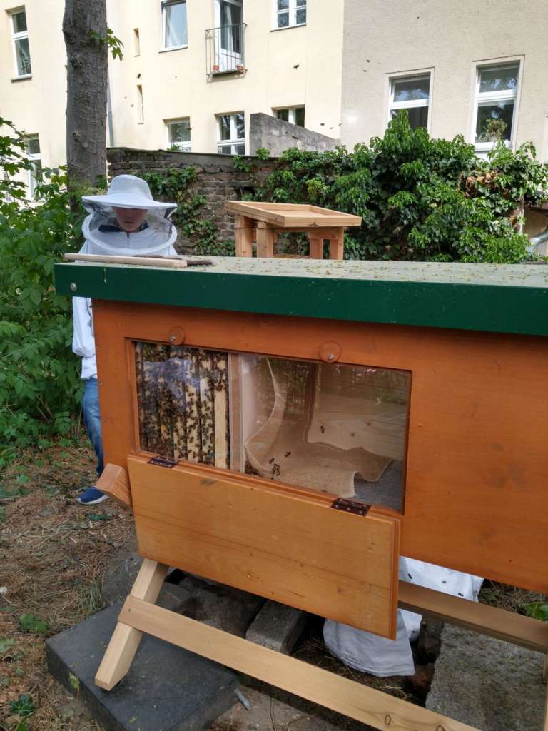 Eine aufregende, geplante und angeleitete Völkerwanderung mit königlichem Empfang durften am Freitag neugierige Naturliebhaber:innen auf dem hintersten Teil unseres Schulgrundstücks (unmittelbar zum angrenzenden Friedhof) miterleben. Richtig gelesen. Unweit vom Grünen Klassenzimmer hinter der Turnhalle konnten mit Hilfe der Bienenexpertin Leonie Wolfrum zwei Kunstschwärme samt ihren Königinnen erfolgreich einlogiert werden. Seitdem beherbergen, beobachten und betreuen wir am ASG zwei eigene Bienenvölker! Dank des Marshmallow-Tricks wurde eine mögliche Flucht der Königin verhindert, die zahlreichen Untertanen nagten sich ihrerseits durch die süße und klebrige Köstlichkeit, um ihre Anführerin zu befreien. Der Einzug scheint damit geglückt. Nach gut drei Wochen herrscht bei den geflügelten Nachbarn inzwischen emsiges Treiben. Ein vielversprechender Anfang – wir hoffen natürlich, dass sich die fleißigen Bienen hier wohl fühlen, vermehren und dauerhaft niederlassen. Unter der fachkundigen Leitung von Frau Wolfrum von Stadtbienen e.V. trifft sich der Bega-Kurs „Imkern“ übrigens immer freitags bei den Bienen. (Treffpunkt 14.30 Uhr Raum 010). Vielleicht gibt es ja dann im nächsten Jahr sogar schon den ersten hauseigenen Schweitzer Honig! Wer sich in diesem Projekt mit engagieren will, bekommt nähere Informationen auch über Herrn Kauffmann oder Herrn Blum. Eine einmalige Gelegenheit, das faszinierende Leben dieser hochspezialisierten Insekten im Jahreslauf hautnah zu begleiten. Interessierte Schüler:innen sollten sich diese auf keinen Fall entgehen lassen sollten!