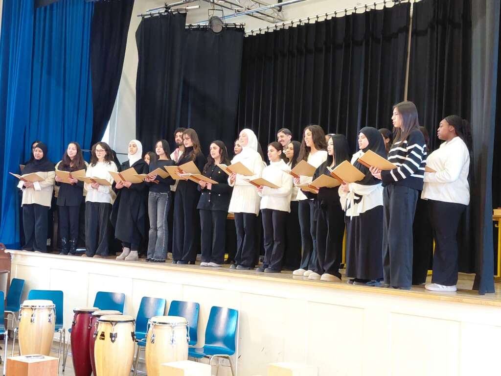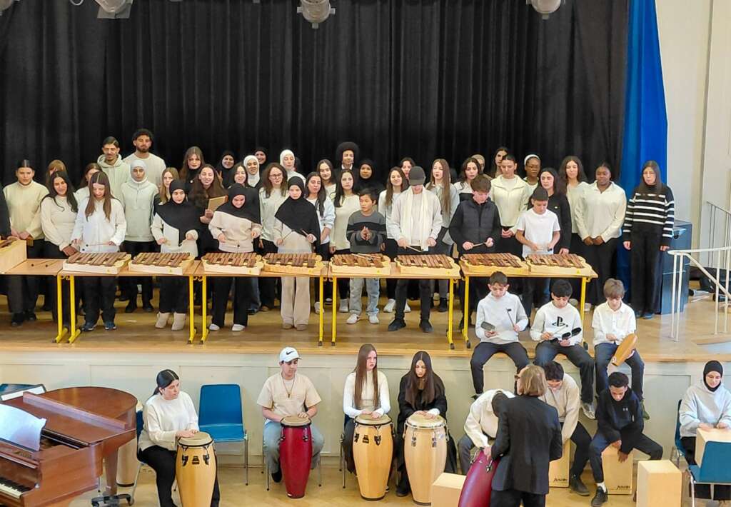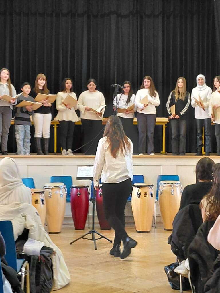 Wieviel Arbeit, Organisation und Vorbereitung in diesem großen Auftritt am Mittwoch steckte, wissen unsere Musiklehrerinnen (Frau Hessou, Frau Kelany und Frau Galiot) vermutlich am besten, die wie immer mit großem Engagement und großer Freude die Schüler:innen auf der Bühne, dirigierten, instrumental begleiteten und mental unterstützten. Ein großes Dankeschön dafür!