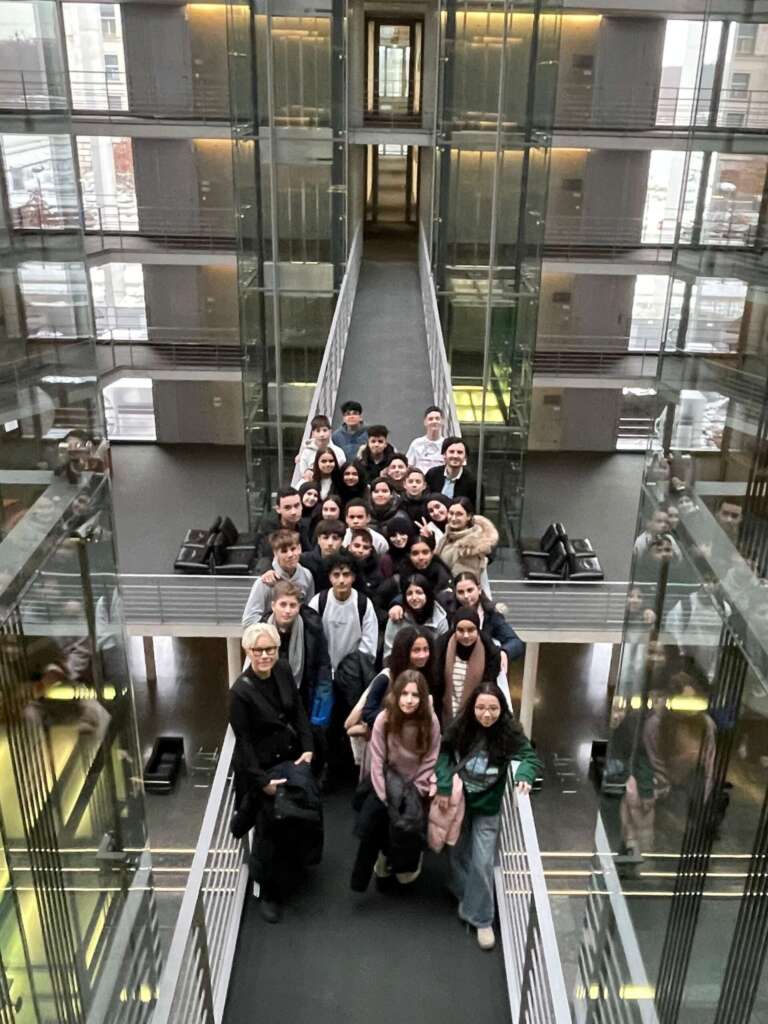 Ein Bundestagsreferent führte die Gruppe zunächst durch das historische Gebäude des Bundestages und anschließend durch das Paul-Löbe-Haus. Die Schülerinnen und Schüler erhielten spannende Einblicke in die Geschichte des Parlaments, seine Arbeitsweise sowie die Abläufe während einer Sitzungswoche. Besonders eindrucksvoll war der Besuch des Fraktionsraums der CDU/CSU. Zudem nahm sich Hakan Demir, Bundestagsabgeordneter aus Neukölln, Zeit für die Klasse. Er zeigte seine Büroräume und stellte sein Team vor.