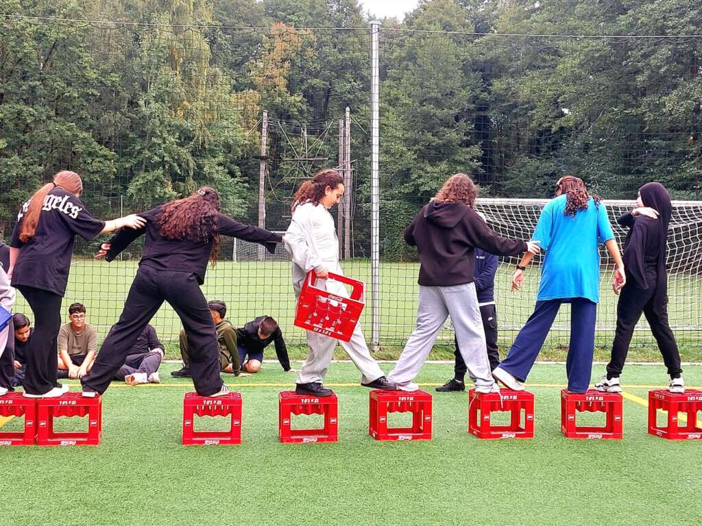 Kennenlernen durfte sich die Klasse 8a bereits im letzten Schuljahr, nun konnte sie bei der Klassenfahrt nach Blossin unter Beweis stellen, wie gut sie als Team funktioniert. Gemeinsam mit Frau Conesa, Frau Busch und Herrn Kiefer verbrachten die 30 Schüler:innen 5 actionreiche Tage in Brandenburg. Bereits die Anreise zur Jugendbildungsstätte beinhaltete eine 5 km Wanderung, die nicht jede(n) zu Freudentänzen animierte. Aber alle machten sich auf den Weg und kamen guter Dinge ans Ziel. In Blossin gab es zum Ausgleich gemütliche Zimmer und jeden Tag bewegungsintensive und teamfördernde Angebote im und am Wasser. Die Sportplätze auf der großzügigen Anlage wurden täglich mehrfach genutzt und am reichhaltigen Buffett in der Mensa konnte man nach den Aktivitäten am Vormittag und am Nachmittag seinen Hunger stillen. Angeleitet von Trainern des Blossin-Teams, fanden u.a. ein Escape Game, eine Team Challenge auf dem Gelände, lustige Gruppenspiele auf den Sportplätzen und eine Disco statt. Zu den besonderen Highlights der Fahrt gehörte sicherlich der Floßbau am Ufer des Sees. Insgesamt 5 Teams tüftelten und probierten gemeinsam, wie man am geschicktesten ein Floß aus Kunststoffröhren, Holzpfählen, Kisten und Seilen zusammenbaut, um die gesamte Mannschaft möglichst sicher übers Wasser zu bringen. Alle Flöße bestanden zunächst die Taufe aber nicht alle hielten am Ende der Belastung stand und lösten sich mitunter in ihre Einzelteile auf, zumal es irgendwann auch äußerst lebhaft und lustig zuging auf den selbst gebauten Schwimm-Objekten. Die ganze Klasse hatte auf jeden Fall sichtlich Spaß, auch wenn die Kleidung bei einigen mehrere Tage brauchte, um wieder richtig trocken zu werden. Auch das Klettern forderte die Schüler:innen mental und physisch heraus und bescherte Einzelnen unvergessliche Erfolgserlebnisse. Viele schafften es, dank des gegenseitigen Ansporns und Sicherns, viel höher zu klettern, als gedacht. In Erinnerung bleiben werden aber sicherlich auch die persönlichen Momente und lustige Situationen auf den Zimmern abseits des gut organisierten Pogramms.