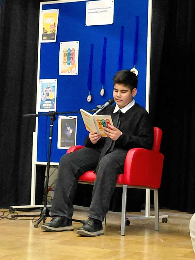 Wie jedes Jahr fand auch diesmal der Vorlesewettbewerb der Jahrgänge 7 bis 10 des Albert-Schweitzer-Gymnasiums in unserer Aula statt. Selbstbewusst und konzentriert präsentierten die teilnehmenden Schülerinnen und Schüler zunächst Auszüge aus ihren selbst gewählten Texten. In der zweiten Runde stellten sie ihr Können erneut unter Beweis, als sie unvorbereitete Fremdtexte lebendig und sicher vorlasen.